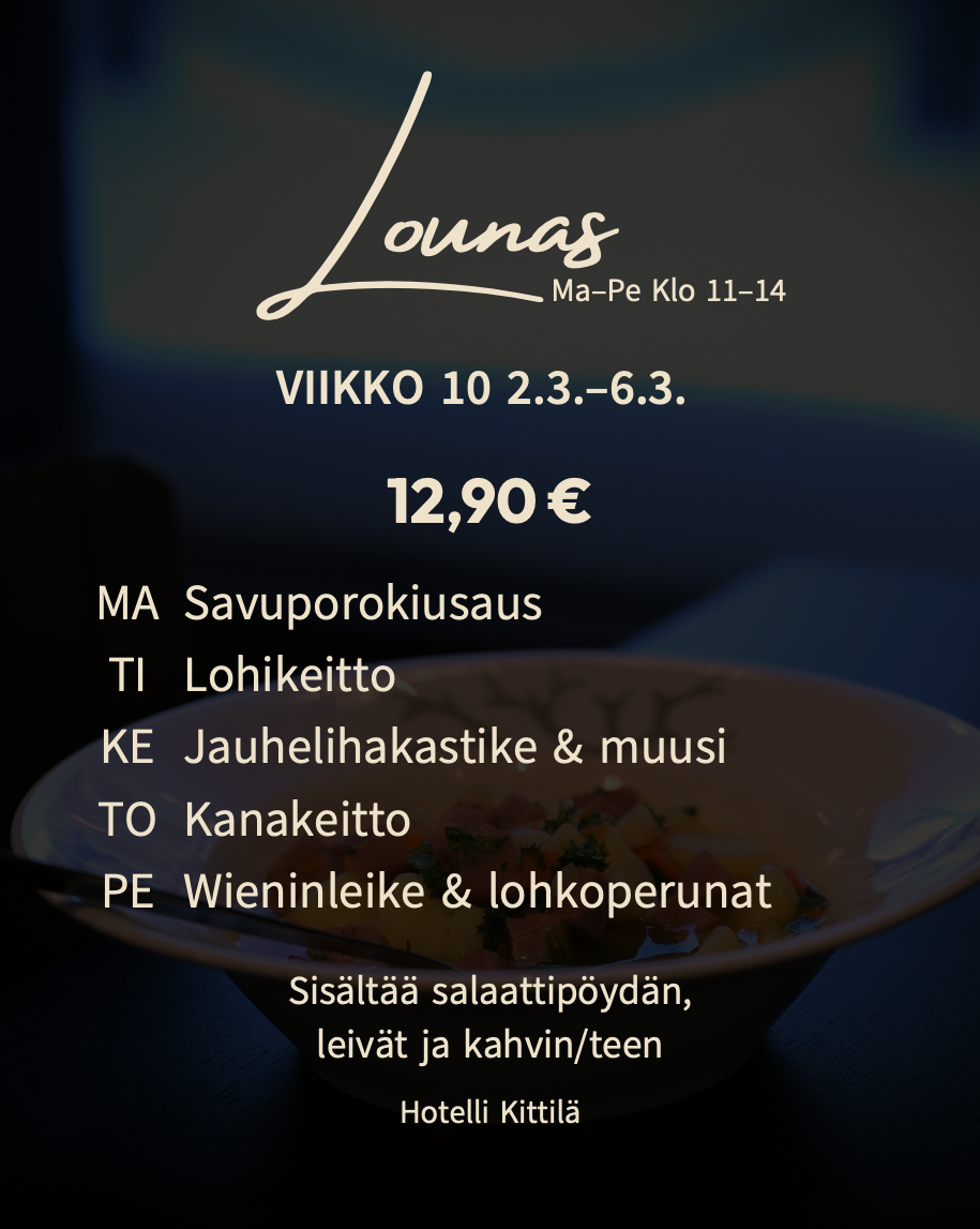 Hotelli Kittilä on lämminhenkinen hotelli keskellä Kittilän kylää paikallisten palveluiden äärellä – vain viiden minuutin ajomatkan päässä lentokentältä sekä 20 minuutin päässä Levin palveluista. Sijaintimme tekee meistä ihanteellisen paikan niin työmatkalaisille kuin lomailijoillekin, jotka arvostavat rauhaa, luontoa ja helppoa saavutettavuutta.