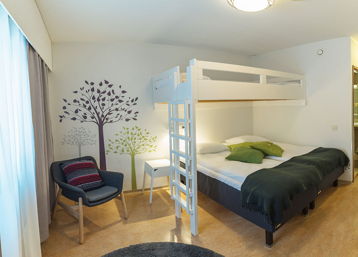Tilava ja kodikas huone, jossa majoittuu mukavasti 3–4 henkilöä. Kaikki perhehuoneet sijaitsevat hotellin ensimmäisessä kerroksessa, joten kulku huoneisiin on vaivatonta pientenkin lomalaisten kanssa.